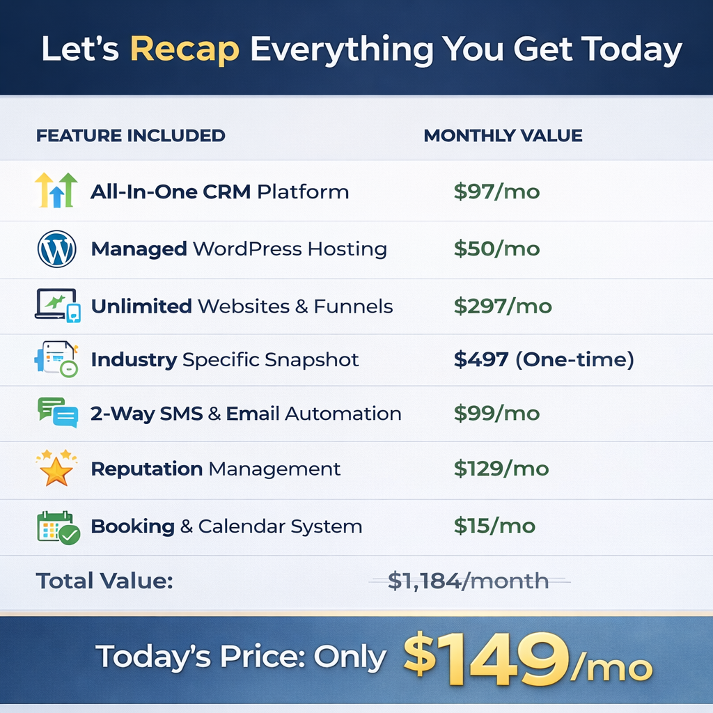 Don’t get left behind. Secure your Hosting, CRM, and Automations for less than the cost of a daily coffee.